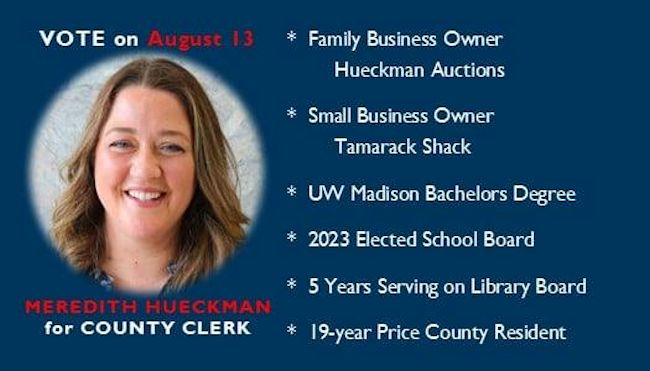 Election day is Tuesday, August 13, 2024. Meredith Hueckman is one of five candidates running for Price County Clerk. To help voters make an informed voting decision, Meredith shared information about her candidacy. For additional information, visit the Facebook page, Meredith Hueckman for Price County Clerk.