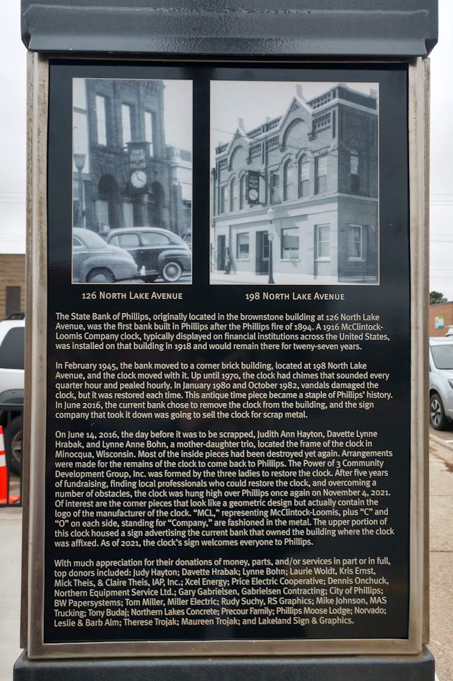 Arriving on November 4, 2022 was the plaque, which was installed in the pole. The plaque gives a history of the clock and recognizes larger contributors to the restoration project. Brian Hopperdietzel at Marshfield Monument, located in Marshfield, Wisconsin, was hired to create this plaque. However, he chose to donate a plaque to the project. He also delivered and installed the plaque. "After reading through the history of the clock and what the three ladies accomplished to bring it back to Phillips, I thought this is the least I can do for the project," Brian said. "Far too often society finds it easier to discard pieces of history instead of restoring and keeping them alive through awareness."