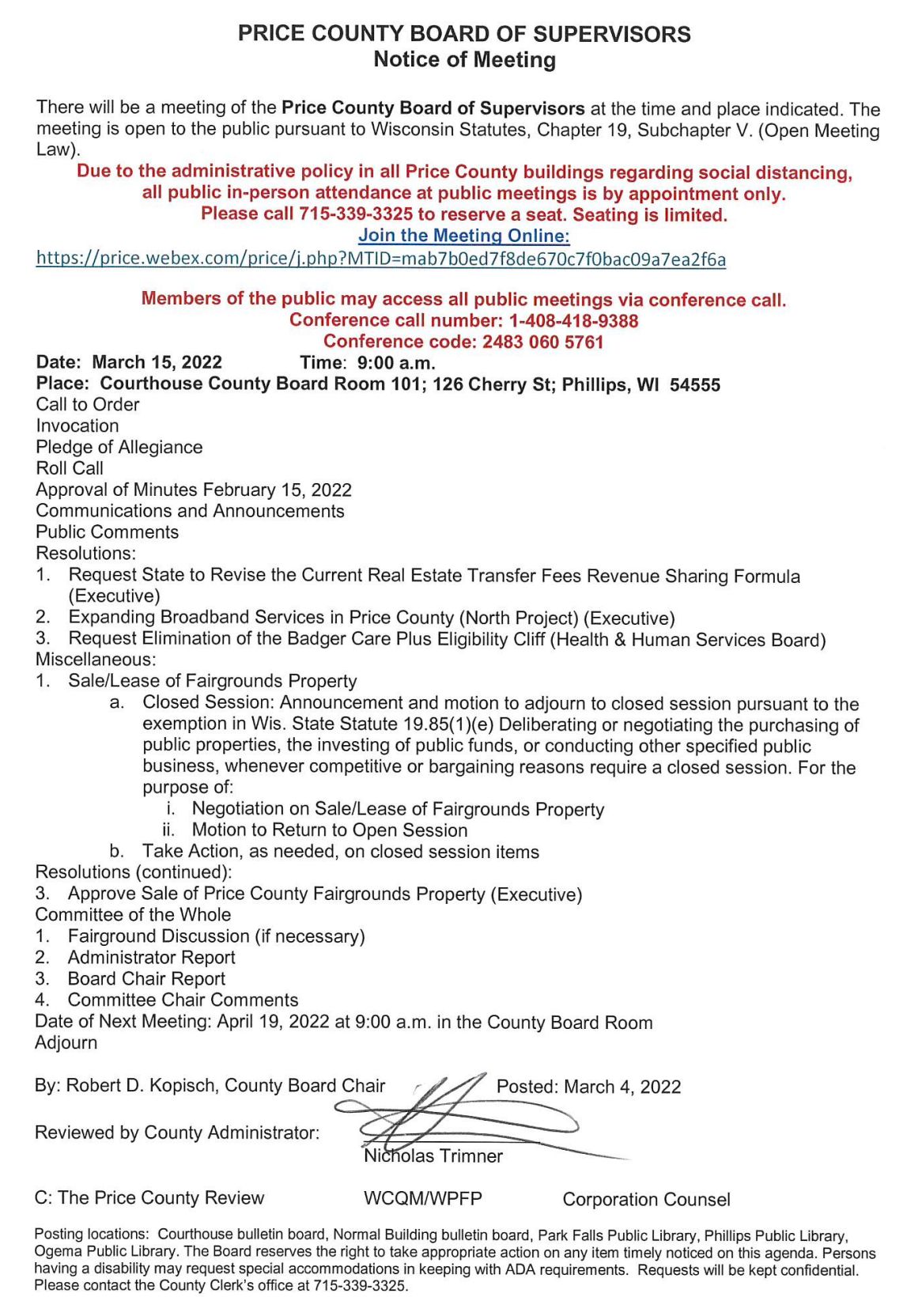 The Price County Executive Committee submitted Resolution 15-22, "Approve Sale of County Owned Property (Price County Fairgrounds)," and it was adopted by the Price County Board of Supervisors on March 15, 2022 with ten in favor of the sale. Douglas Erickson and Ginny Strobl voted against the sale. Per Wisconsin State Statute §59.52(6)( c ), the county board may "direct the clerk to lease, sell or convey or contract to sell or convey any county property...on terms that the board approves."