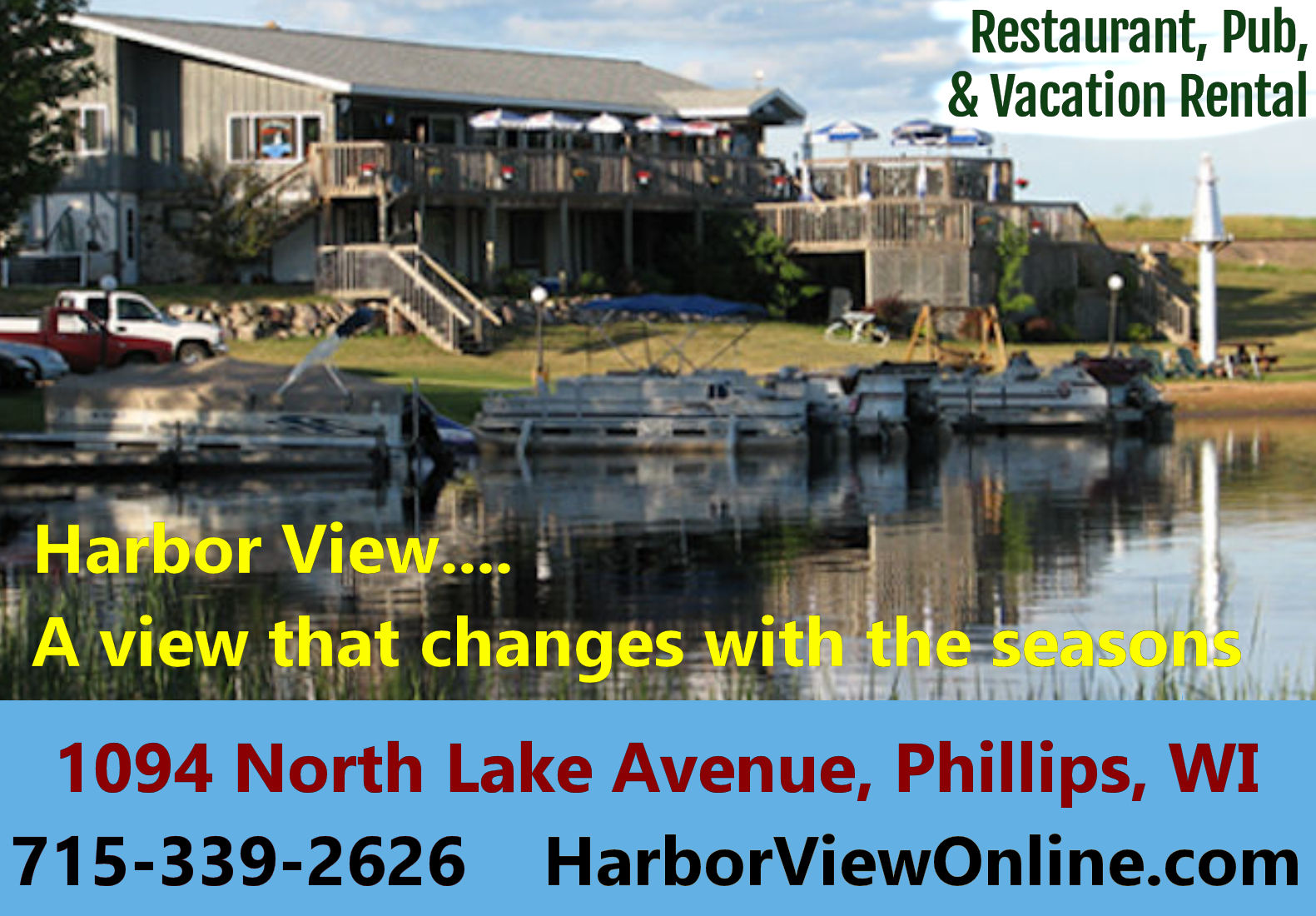 SUPPORT LOCAL BUSINESSES - SHOP PRICE COUNTY FIRST: Stop by Harbor View Pub & Eatery, a view that changes with the seasons. This restaurant, pub, and vacation rental is located at 1094 North Lake Avenue in Phillips. View Harbor View's website, follow their Facebook page, or call 715-339-2626.