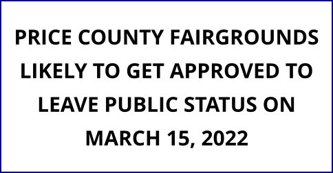 On Tuesday, March 15, 2022, the Price County Board of Supervisors will meet at 9 a.m. On the agenda is the possible sale of the Price County fairgrounds, which is 40-some acres and has water frontage, out of public status and into private status.