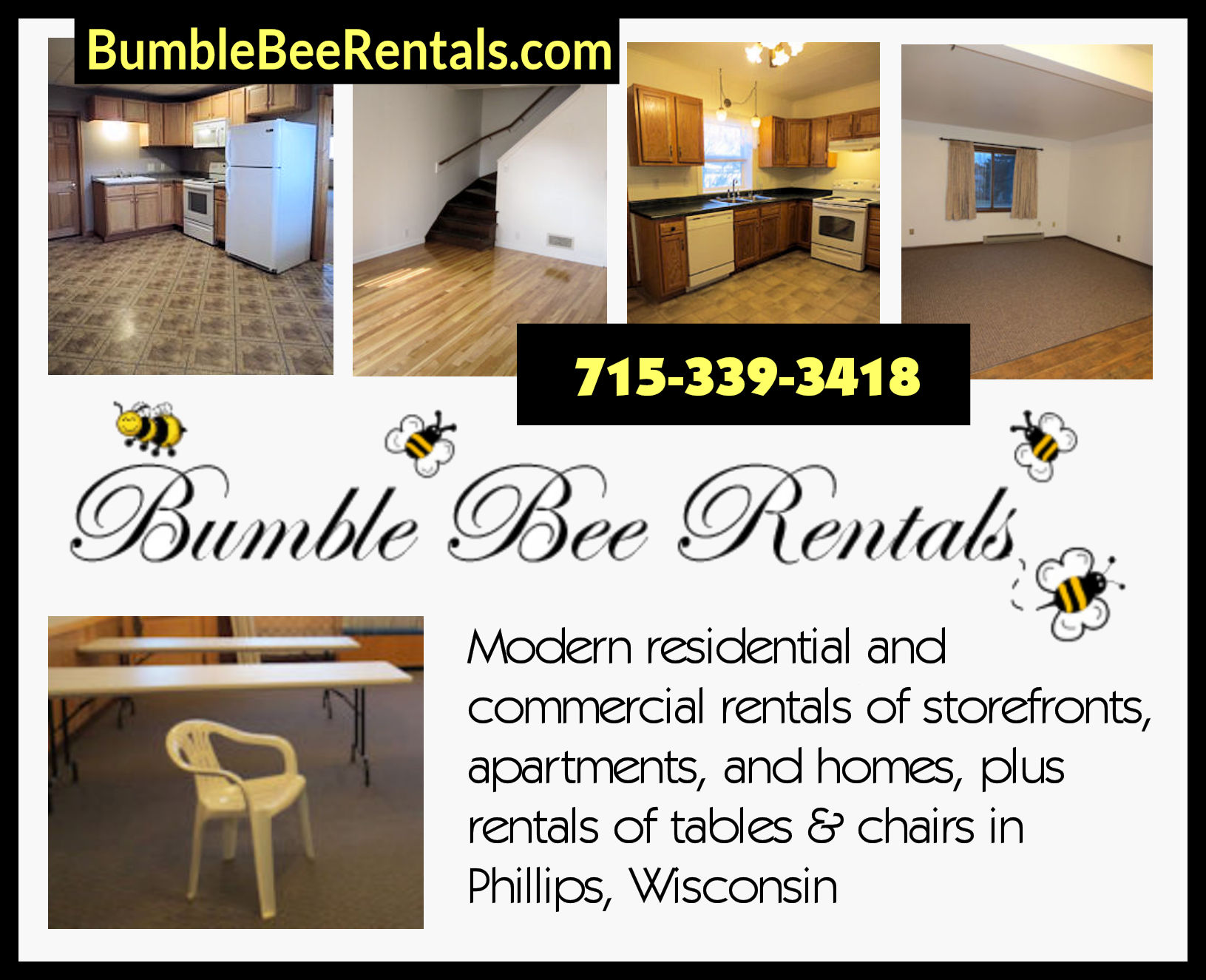 (The article continues after the promotional message.) SUPPORT LOCAL BUSINESSES - SHOP PRICE COUNTY FIRST: Bumble Bee Rentals offers rentals of tables & chairs for parties and other events. Visit Bumble Bee Rental's website to view the tables & chairs or call 715-339-3418 to reserve your event date.