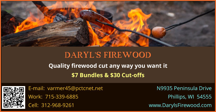 SUPPORT LOCAL BUSINESSES - SHOP PRICE COUNTY FIRST: With many face cords of maple and red oak on hand and ready, there is plenty of firewood for your needs at Daryl's Firewood. Visit Daryl's Firewood's website or call Daryl at 715-339-6885 or 312-968-9261 for pick-up or delivery in Price County. Follow Daryl's Firewood's Facebook page.