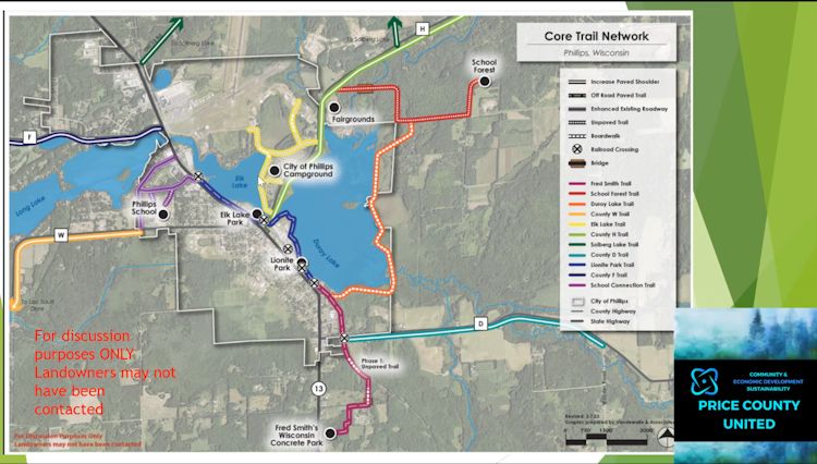 As for the trails, a map was presented. However, Lyn said not all landowners have been contacted, so there are not current approvals for all the areas presented. The yellow area shows the trails that could be implemented this year if there is approval by the City of Phillips, which Lyn stated is being "explored," though a previous city meeting did reject PCUL's idea to have trails running through the cemetery so an alternate route, possibly by the campground and along the shoreline, would need to be presented and approved.