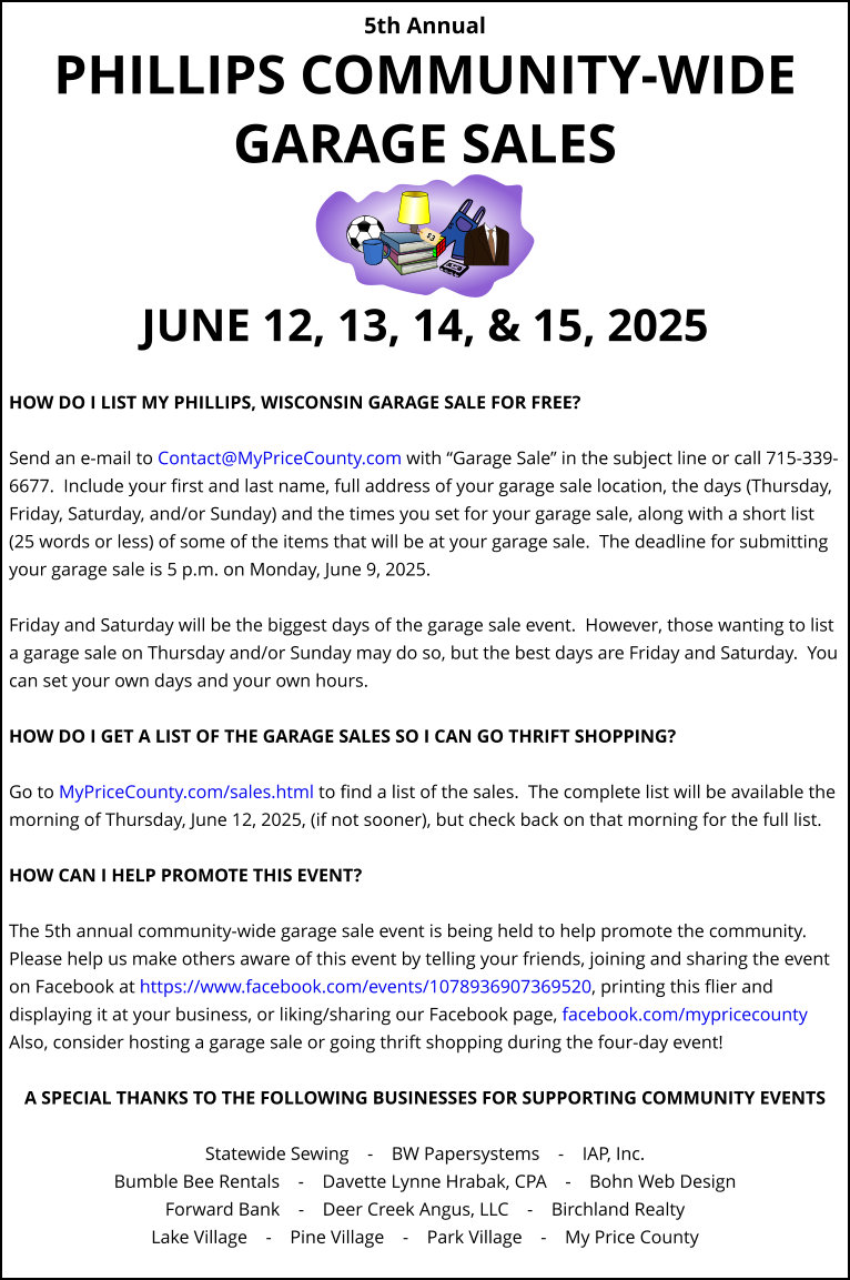 The PHILLIPS 2025 COMMUNITY-WIDE GARAGE SALES EVENT will be held from June 12 to 15, 2025. Join the Facebook event page. Get your sale listed for FREE; information can be found at this link. The sales will be listed at this link by the morning of June 12, 2025.