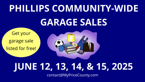 My Price County is offering free advertising to residents who would like to have a garage sale on that weekend. To participate, reserve your ad spot by submitting your first and last name, full address of your garage sale location, the days (Thursday, Friday, Saturday, and/or Sunday) and the times you set for your garage sale, along with a short list (25 words or less) of some of the items that will be at your garage sale. Either message My Price County on Facebook or send an e-mail to Contact@MyPriceCounty.com with "Garage Sale" in the subject line. While getting the garage sales sent via e-mail is preferred, you can call 715-339-6677 if you do not have access to Messenger or e-mail. My Price County will confirm receipt of all messages and e-mails. The deadline for submitting your garage sale is 5 p.m. on Monday, June 9, 2025. Please note, you will need to place your own garage sales signs and do any additional advertising that you choose.