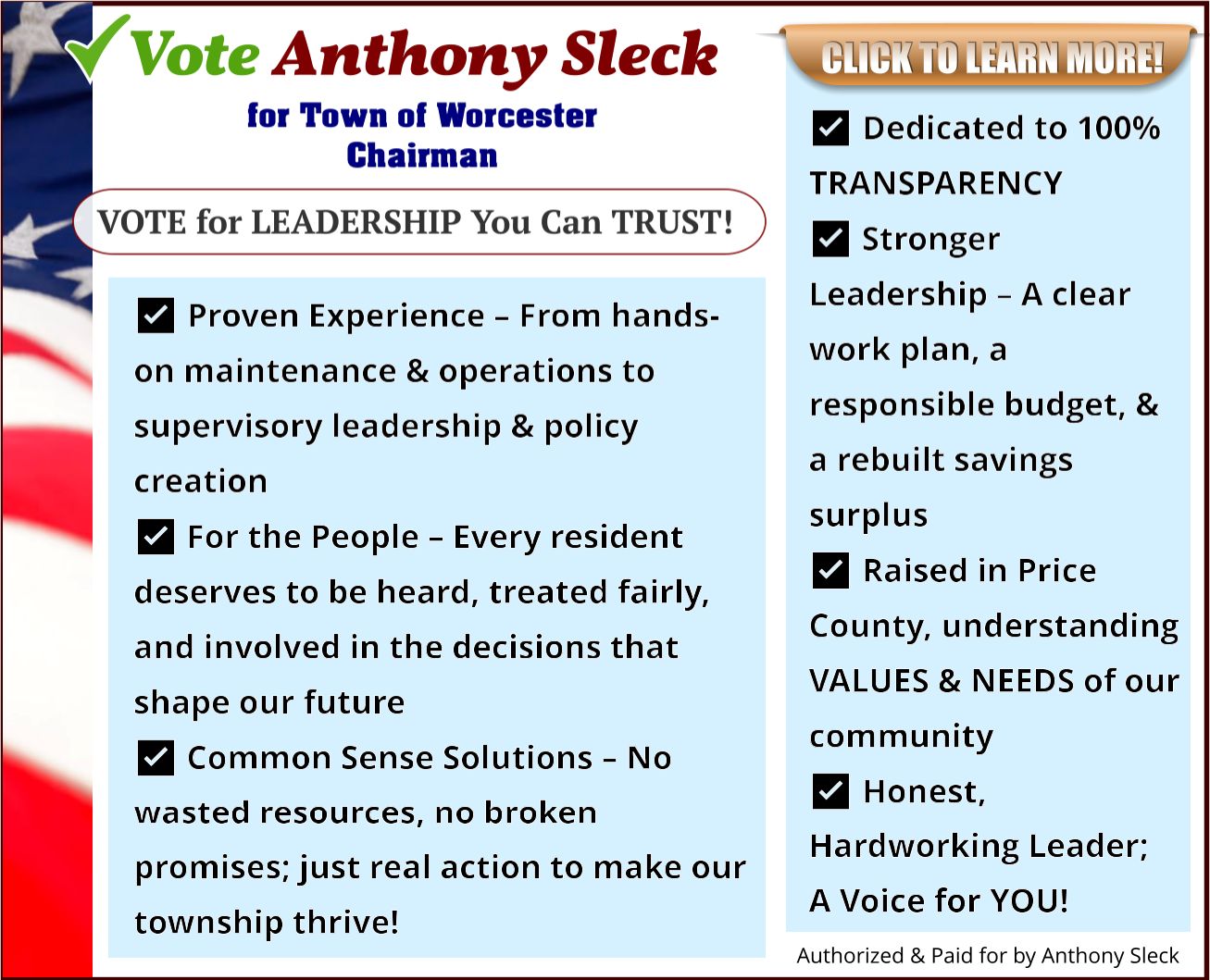 Authorized and paid for by Anthony Sleck for Town of Worcester Chairman