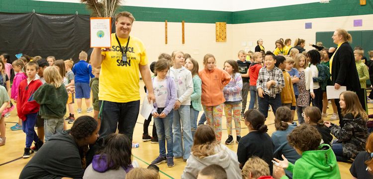 Mr. Grams, a 2nd grade teacher from Park Falls Elementary School of the Chequamegon School District, is pictured proudly holding the monthly traveling Peacock trophy. Mr. Grams' class is the May "RED" (Read Every Day) winning classroom. His students read the most out of all the classrooms in the school.