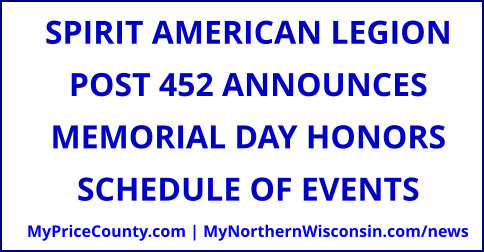 "It is that time of year in which we veterans start thinking about Memorial Day," Duane Harper, Commander, American Legion Post 452, said in April when he submitted the schedule to My Price County / My Northern Wisconsin. The Spirit American Legion Post 452 will be rendering honors at the following cemeteries.