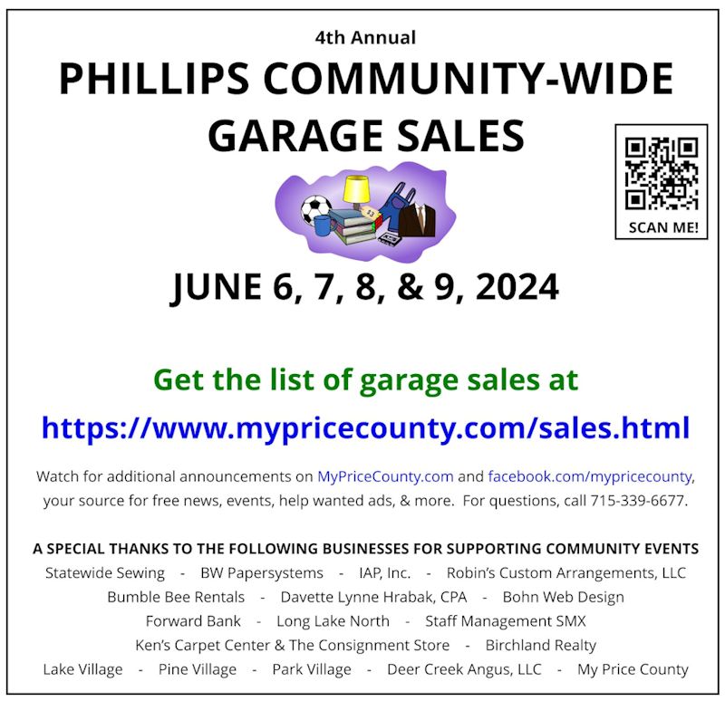 The Phillips Community-wide Garage Sale Event will be back in June 2025. My Price County is considering having a county-wide sale later in the summer, so stay tuned to see if that materializes this year. Otherwise, it is something we will highly consider for next summer.