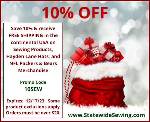 (Article continues after promotional image.) Statewide Sewing is your local source for your sewing needs, plus Packers & Bears merchandise and Hayden Lane hats. Receive 10% off and free shipping with a $20 order with promo code 10SEW. Visit Statewide Sewing's website for new & used sewing machines, sewing parts & accessories, notions, and gifts. For promo codes and sewing tips & memes, follow the Statewide Sewing Facebook page.