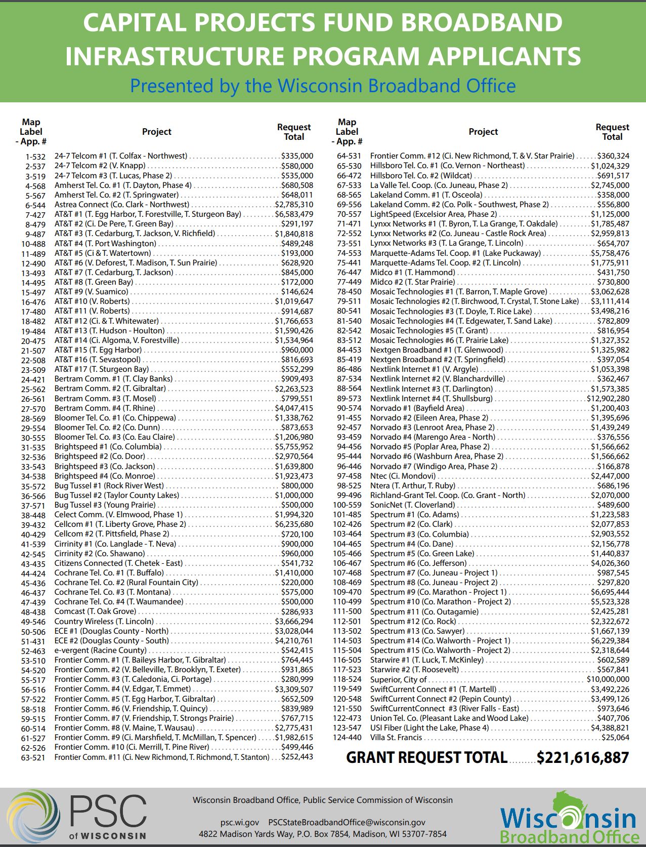 "The Public Service Commission (PSC) is expected to award up to $42 million under the American Rescue Plan Act’s Capital Projects Fund (CPF) to administer Broadband Infrastructure Grants and invest in broadband construction and deployment that will provide high-quality Internet to locations that lack access to adequate, affordable service. The ratio of requested funding to available funding is the highest for any grant round since the first in 2014," according to the office of Governor Tony Evers.