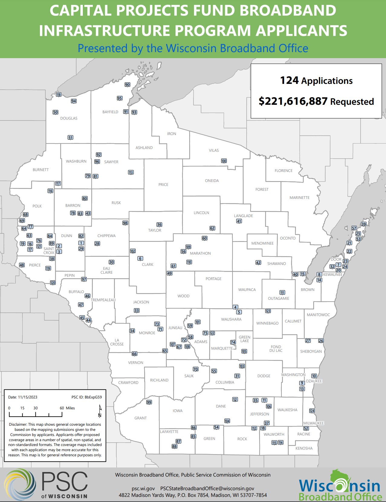 The Wisconsin Broadband Office received 124 applications requesting $221.6 million for the Broadband Infrastructure Grant Program.