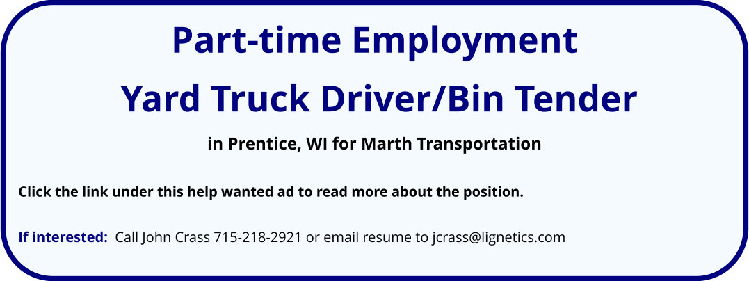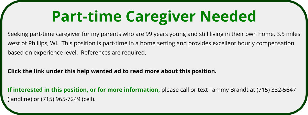 JOB OPPORTUNITY: PART-TIME CAREGIVER Click this link for more information. If interested in this position, or for more information, please call Tammy Brandt at 715-332-5647 (landline) or 715-965-7249 (cell).