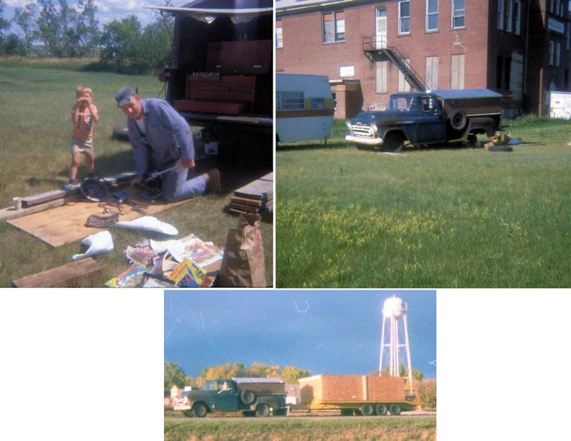 As we were rolling into Ross, N.D. we smelled the odor of a hot lubricant. We managed to coast down the hill right into the yard of an abandoned schoolhouse. Unfazed by the seeming disaster, Dennis went to work jacking up the back end of the truck and replacing the pinion bearings and seals. I gotta say, he may often end up off the road, but the good Lord has blessed him with a mechanical brain, so he manages to always get back on life's highway fairly quickly. We were stranded in Ross for several days because the parts had to be ordered from a nearby town, but the breakdown turned out to be a wonderful time for the kids since the swings and playground equipment were still there in the schoolyard.