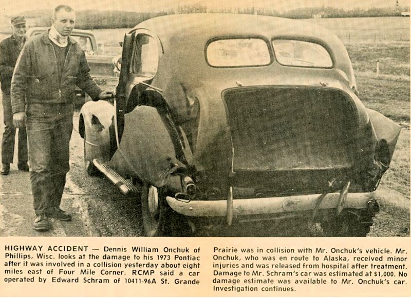 From the hospital ER in Grand Prairie, Dennis wrote these words in his journal, "It is 1:15 PM, April 29, 1973, and my trip and 1937 Pontiac has come to an end. I was hit from behind so hard I thought my time had come." He would later be told by RCMP that the guy was VERY drunk and driving around 100 MPH.