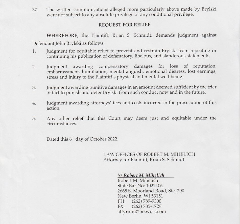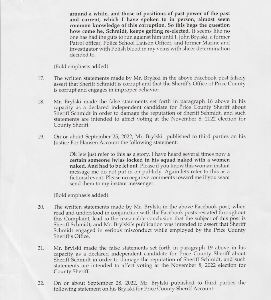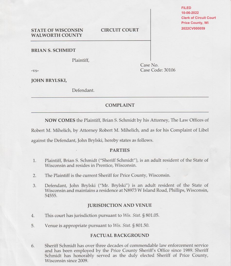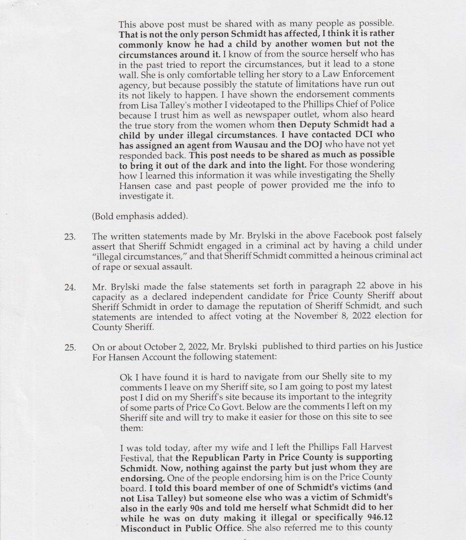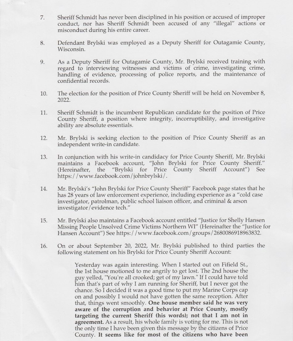 Attorney Robert M. Mihelich, with a law office in New Berlin, Wisconsin, filed a complaint on behalf of his client, Brian S. Schmidt. Five posts, published by John Bryski on social media, are cited in the complaint. The posts were made on a Facebook page, "John Brylski for Price County Sheriff," and a Facebook group, "Justice for Shelly Hansen Missing People Unsolved Crime Victims Northern WI."