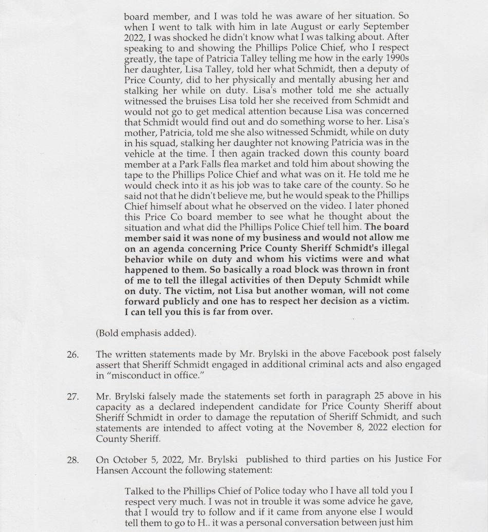 "In #7 of Brian Schmidt’s complaint of civil libel, it states he has never been disciplined, etc. My opinion on why Sheriff Schmidt was never disciplined is because I believe the sheriff’s office failed to properly investigate complaints filed with them when he was a deputy, or his actions were done in secret while on duty so the sheriff’s office did not learn about them. I first learned of this alleged misconduct and names of alleged victims from prior sheriffs of Price County while investigating the cold case disappearance of Shelly Hansen in 1987. I felt once I learned of this alleged misconduct of Schmidt, some even rising to unlawful, I felt it was my duty to Price County citizens to bring these allegations forward as I had the ability to properly investigate them and could not live with myself if I did not. I have statements from victims and people who know them. When I refer to "victims," I am not saying “alleged” as the victims and their families believe them to be truthful, and I find them to be truthful people. Some have stated their daughters were so traumatized and feared repercussions so they only confided in their family and friends and later, to me, as they trust me. In my reply, I will give only a few examples of what I am speaking of from the victims themselves or from their family members, but I have a number of statements supporting what I have said.