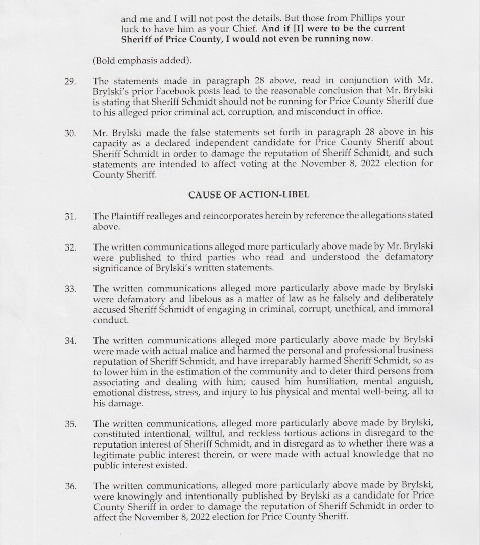 A jury trial was scheduled for November 4th through the 7th, 2024 in the Price County Courthouse for the intentional tort (libel) case Sheriff Brian Schmidt filed against John Brylski on October 6, 2022, one month before the election. Sheriff Schmidt was on the ballot in that election, running for Price County sheriff, and John Brylski was a write-in candidate for the same position.