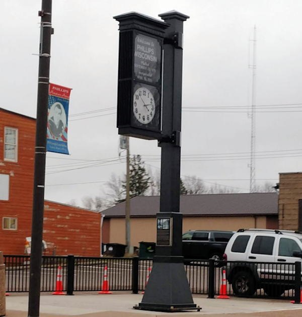 Arriving on November 4, 2022 was the plaque, which was installed in the pole. The plaque gives a history of the clock and recognizes larger contributors to the restoration project. Brian Hopperdietzel at Marshfield Monument, located in Marshfield, Wisconsin, was hired to create this plaque. However, he chose to donate a plaque to the project. He also delivered and installed the plaque. "After reading through the history of the clock and what the three ladies accomplished to bring it back to Phillips, I thought this is the least I can do for the project," Brian said. "Far too often society finds it easier to discard pieces of history instead of restoring and keeping them alive through awareness."