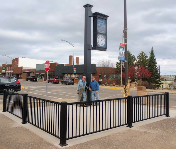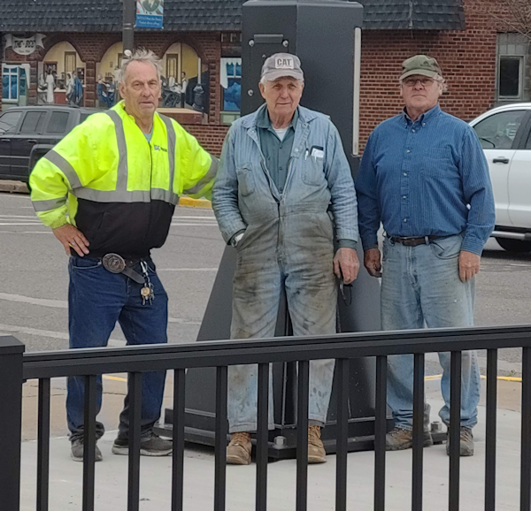 On November 3, 2022, Dennis Onchuck and Mic Peterson installed the black metal railing with assistance from Gary Hall, donating all their time. Dennis also donated the concrete anchor bolts, and Mike Johnson donated the use of his hammer drill. This railing serves as a visual barrier and decorative purpose to offset the pocket park from the parking lot. The railing had to be placed in from the sidewalk a bit so that the City of Phillips will be able to get their snow removal and sweeper equipment on the sidewalks where needed.