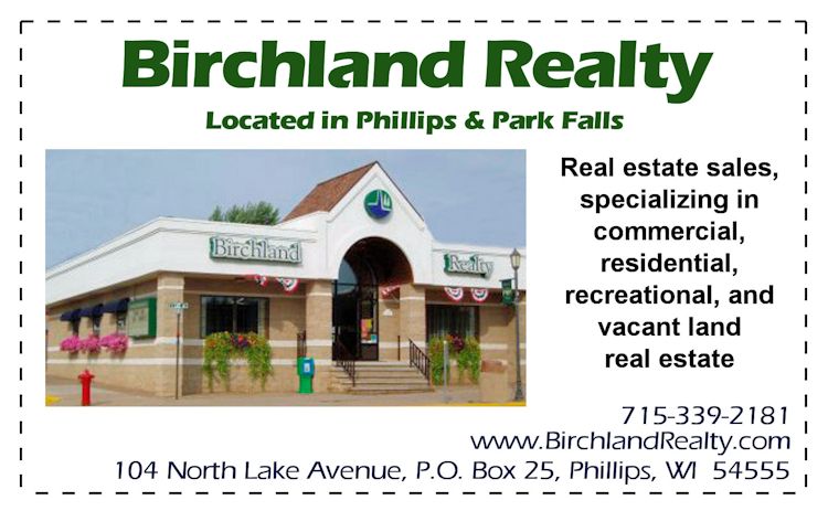 (Article continues after promotional message) SUPPORT LOCAL BUSINESSES - SHOP PRICE COUNTY FIRST: Birchland Realty, located at 104 North Lake Avenue in Phillips, specializes in commercial, residential, recreational, and vacant land real estate. Visit Birchland Realty's website or call 715-339-2181 for assistance finding your new property.