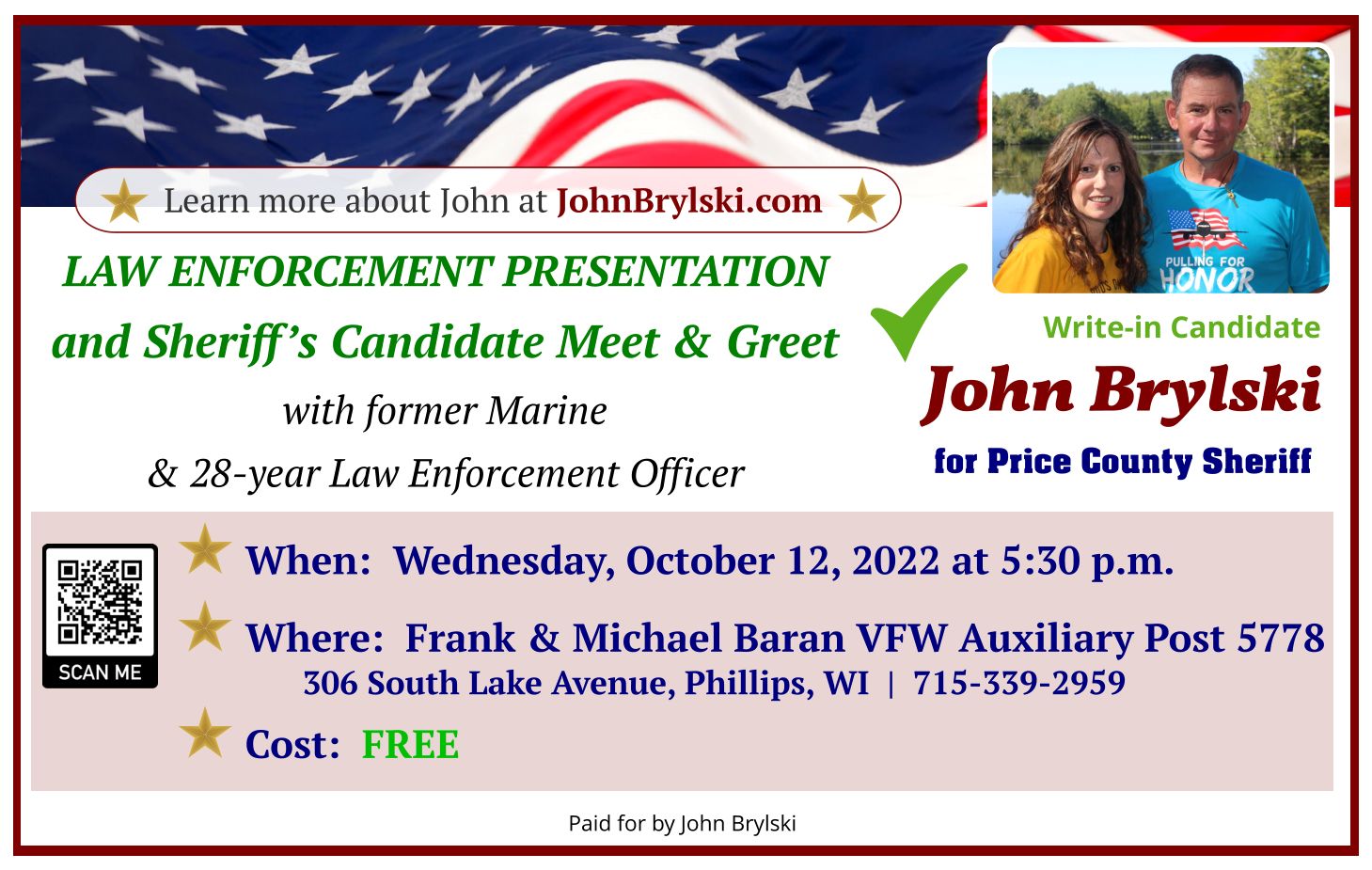 Come out and meet the independent write-in option for Price County Sheriff on Wednesday, October 12, 2022 at 5:30 p.m. at the Frank & Michael Baran VFW Post 5778 at 306 South Lake Avenue in Phillips.