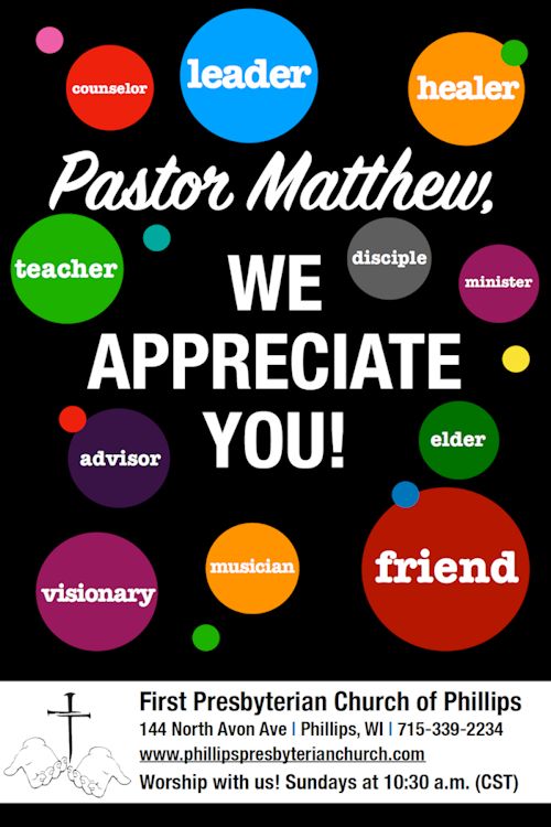 The First Presbyterian Church of Phillips, https://www.PhillipsPresbyterianChurch.com, extends their appreciation for Pastor Matthew Arneson in October, during Pastor Appreciation Month, and every month of every year.