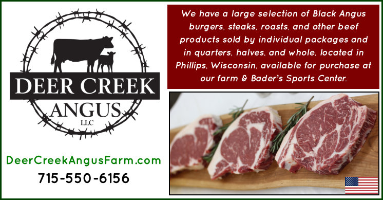 (Article continues after promotional message) SUPPORT LOCAL BUSINESSES - SHOP PRICE COUNTY FIRST: From burgers for grilling to bacon-wrapped tenderloins, Deer Creek Angus, LLC has a large selection of Black Angus beef sold by individual packages and in quarters, halves, and whole. Contact Deer Creek Angus, LLC at 715-550-6156, find products & pricing on their website, and follow their Facebook page.