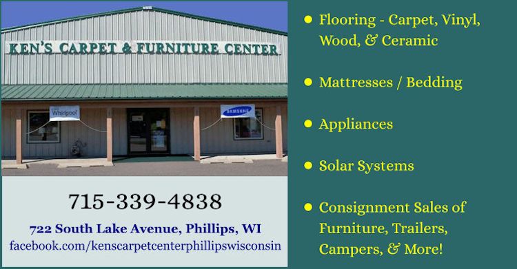 (Article continues after promotional image) SUPPORT LOCAL BUSINESSES - SHOP PRICE COUNTY FIRST: Ken's Carpet & The Consignment Store sells all flooring types (carpet, vinyl, wood, & ceramic), bedding / mattresses, appliances, solar systems, and consignment sales of furniture, automobiles, farming & logging equipment, ATVs, UTVs, trailers, and campers. Call 715-339-4838 for product inquiries, and follow Ken's Carpet & The Consignment Store's Facebook page.