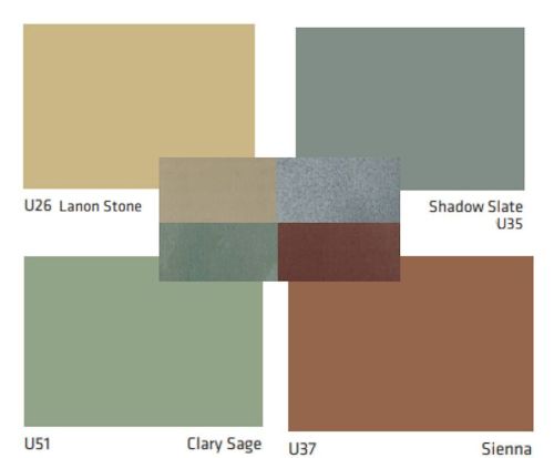 The image shows the color choices. The outer color swatches were presented to the business owners in a survey from the city, which was taken from a file from the company. The inner color swatches came from a photo of the page of colors, which were presented by Ayres Associates at the meeting; the photo was taken by My Price County. The colors shown online versus in-person have different shade variations, so these swatches show a general concept of the colors.
