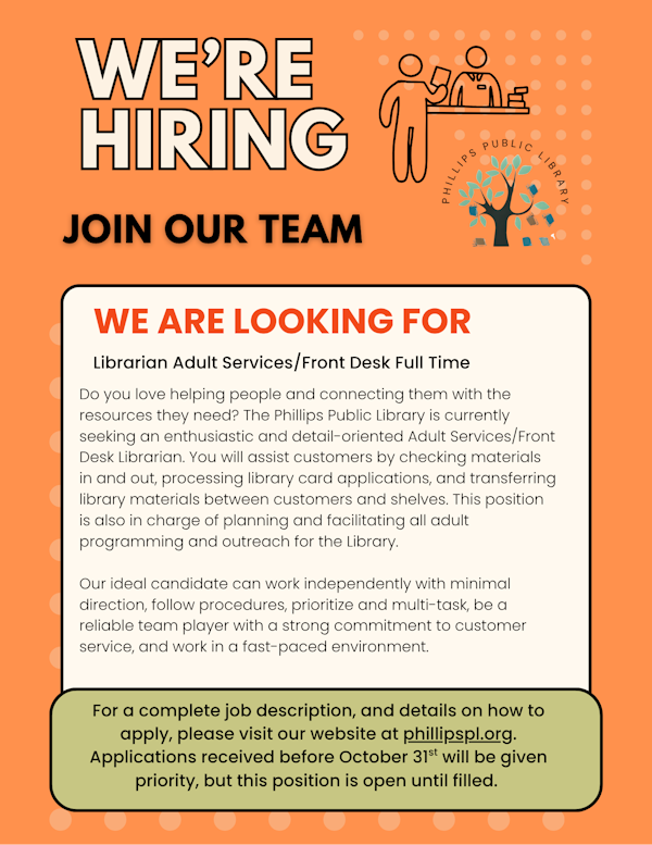 Do you love helping people and connecting them with the resources they need? The Phillips Public Library is currently seeking an enthusiastic and detail-oriented Adult Services / Front Desk Librarian. You will assist customers by checking materials in and out, processing library card applications, and transferring library materials between customers and shelves. This position is also in charge of planning and facilitating all adult programming and outreach for the library.